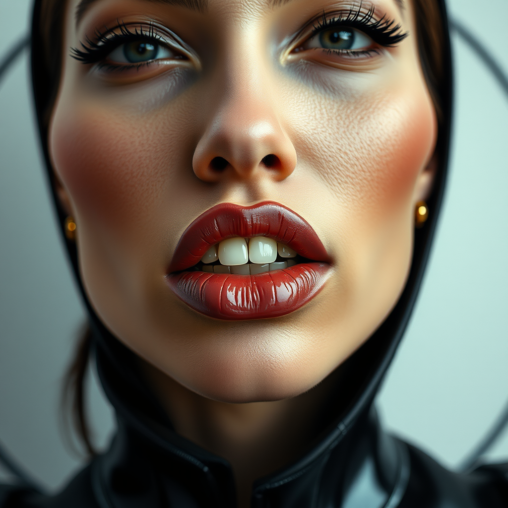 A striking woman with a pronounced jawline and shimmering gold teeth stands out in a futuristic minimalist setting, where restrained forms and intricate details merge seamlessly. Her presence exudes dark romanticism, capturing the essence of a Bechers' typology, with a glossy, polished finish that highlights every contour and feature. The close-up shot reveals the complexity and beauty of her visage, juxtaposing bold modernity with timeless allure, painted in subtle hues and shadows, offering a raw yet elegant perspective on contemporary elegance.