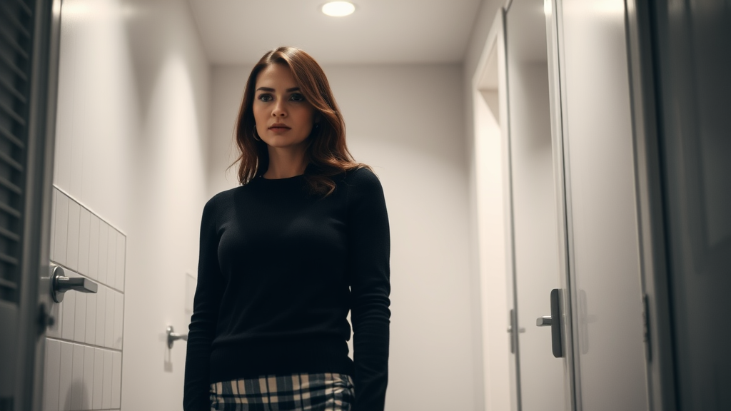 A striking woman with an elegant presence, dressed in a sleek black sweater and a chic checkered mini skirt, standing in a bathroom hallway. Her expression is pensive, captured with soft volumetric lighting that highlights her features. The scene is captured in high detail, with a realistic, fine-art photography touch, offering a subdued contrast for a natural and intimate atmosphere.