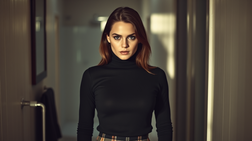 A striking woman with an intense gaze stands in a bathroom corridor, dressed in a sleek black turtleneck sweater and a stylish plaid mini skirt. Soft, ambient lighting casts gentle shadows across the scene, emphasizing the contours of her features. Her expression is thoughtful and focused, as if contemplating something significant. The atmosphere is bathed in muted tones, creating a harmonious blend of realism and high detail, captured in a photograph with a subtle, understated contrast.