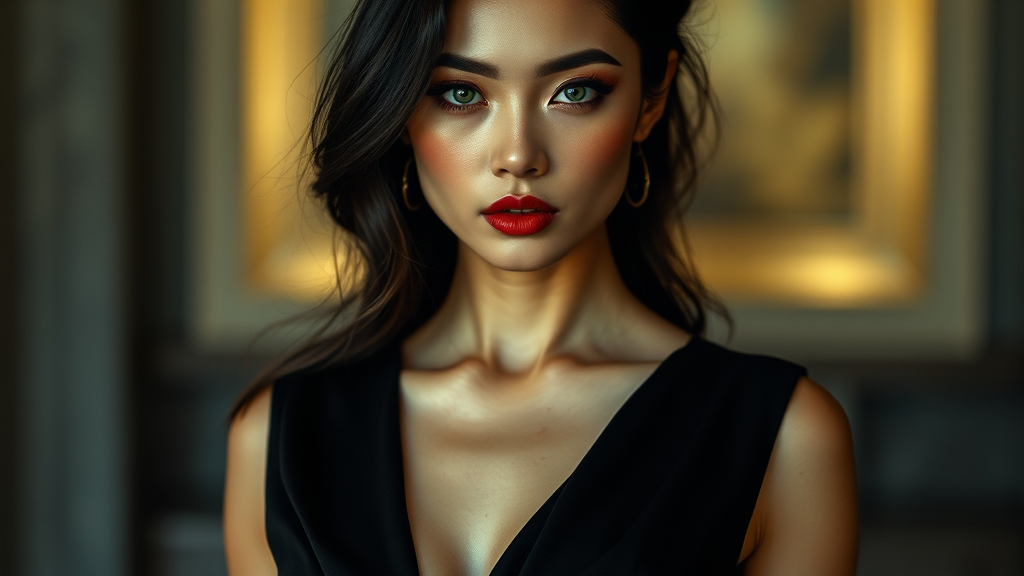 A striking woman with Asian features, characterized by her full lips and vibrant green eyes, bears a subtle scar on her chin. She wears a sleek black dress that accentuates her graceful silhouette, evoking a cinematic allure. Her poised demeanor and captivating gaze suggest a story of mystery and elegance, drawing attention effortlessly.