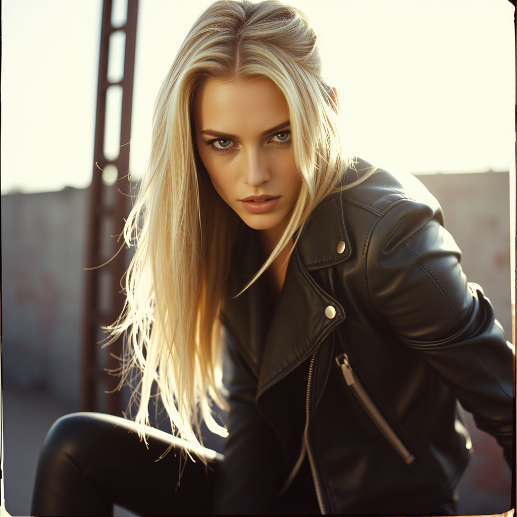 A striking woman with blond hair, donned in a sleek leather jacket and pants, embodies the fierce spirit of black and heavy metal. Her eyes squint with intensity as she leans forward, her presence highlighted by dramatic, cinematic lighting under the sun's glow. The scene, reminiscent of a vintage Kodak Portra 800 film, captures her allure in the style of a classic Polaroid photo, evoking a timeless rock-and-roll vibe.