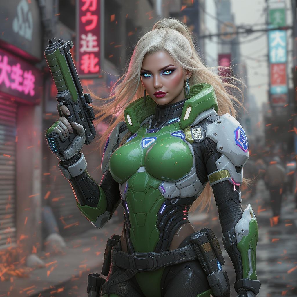 A striking woman with captivating features wears a futuristic green and white uniform, seamlessly integrated with cyberpunk military gear and sleek body armor. She confidently strikes a dynamic pose, holding a high-tech firearm with precision. Her eyes are sharp and focused, reflecting hints of neon hues, while the intricate patterns on her gear glow subtly. The digital artwork emphasizes the fusion of elegance and power, capturing an aura of strength in a vibrant, chaotic urban landscape.