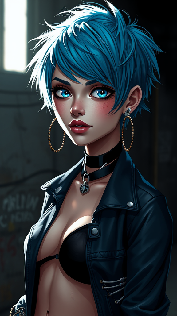 A striking woman with disheveled azure hair and multiple piercings stands against a stark, shadowy backdrop. Inspired by Charlie Bowater's artistry, this character portrait captures a sharply focused, smooth, and highly detailed aesthetic. Her piercing blue eyes are bright and lifelike, framed by the intricate texture of her face, embodying both cartoon style and high-res realism. She wears a black choker that complements her edgy earrings and other jewelry, accentuating her lips and nose piercings. Her short hair contrasts against the dark industrial setting, where cinematic lighting highlights her elegant pose. Dressed in rock-inspired attire, she sports a leather shirt that reveals a tattoo on her arm and her navel. Her dark makeup adds to her allure, with a beautiful, detailed glow illuminating her features. The scene is rendered with octane precision and RTX quality, capturing the intricate detail and realism of her expression and attire.