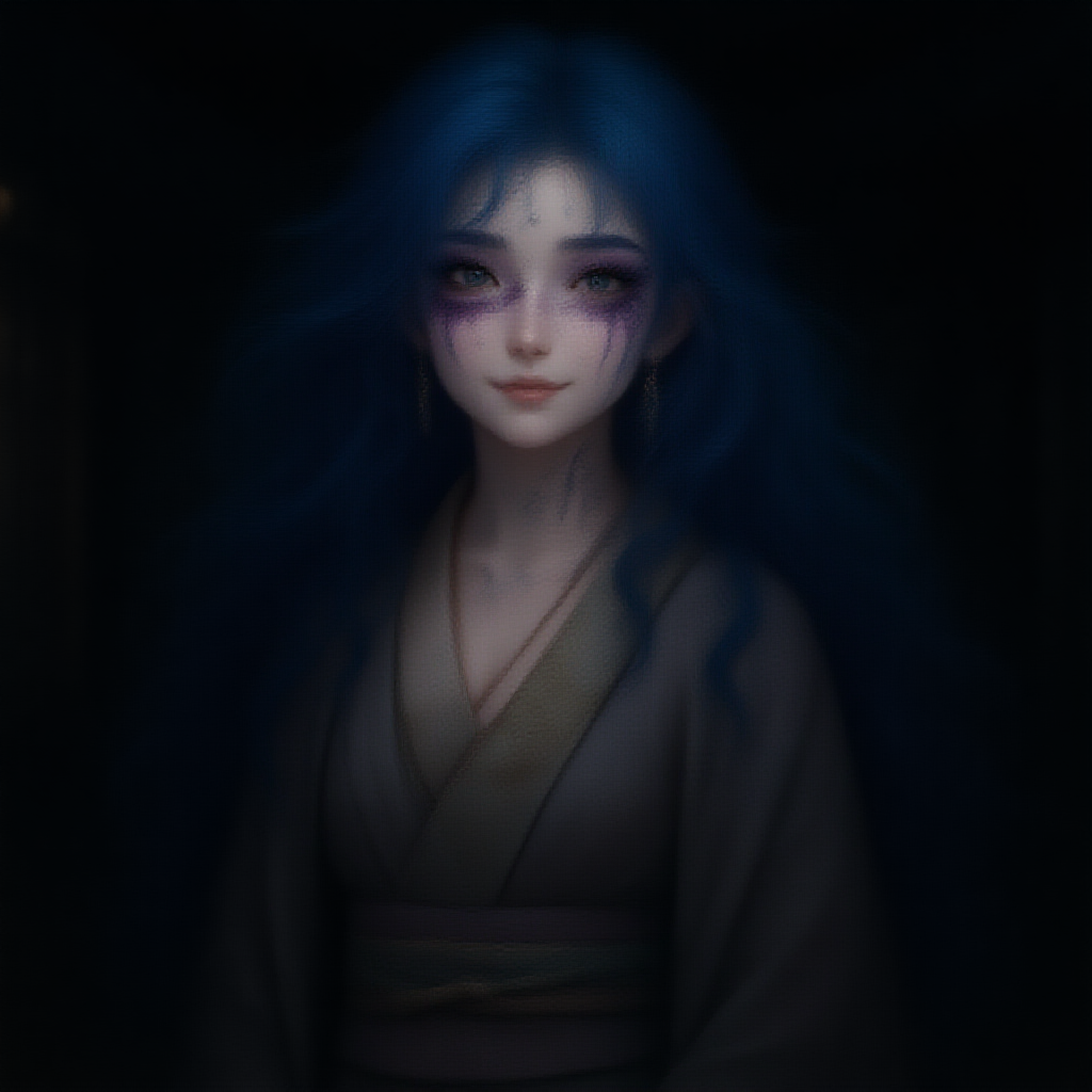 A striking woman with flowing blue hair, adorned in a traditional kimono, her face artfully painted in geisha makeup accentuating her deep, enigmatic eyes, stands in a dimly lit, serene Japanese setting. Her skin glistens with a playful splash of mud, adding an element of nature's embrace to her elegance. The scene captures a sense of tranquility and mystery, blending cultural authenticity with an animated, cartoon-like essence.