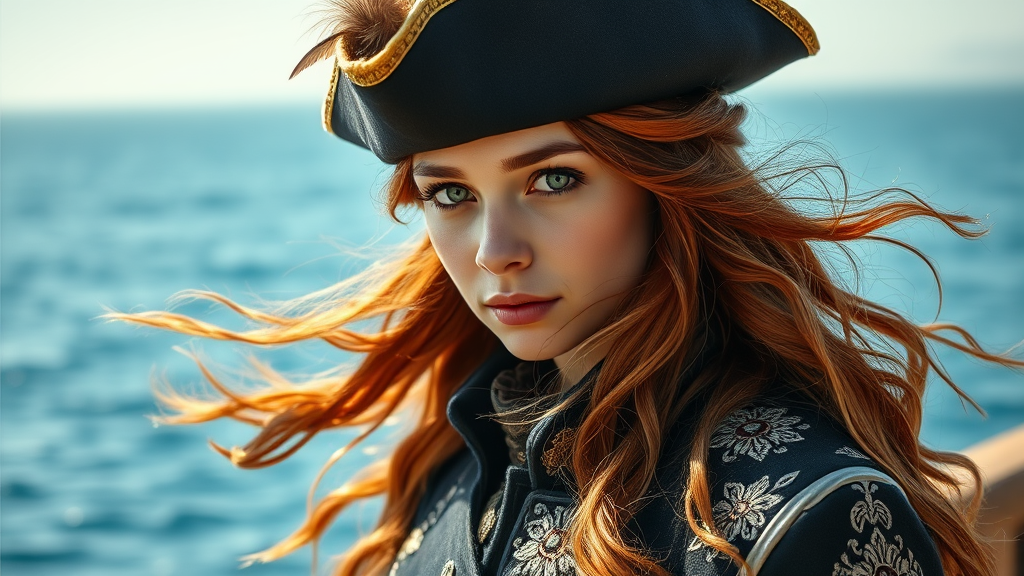 A striking woman with flowing chestnut hair stands by the tranquil blue ocean, adorned in an ornate tricorn hat decorated with feathers, and a richly detailed navy jacket adorned with intricate embroidery. Her piercing green eyes hold a hint of mystery and determination, reflecting an adventurous spirit. The sunlight glistens on her skin, and a subtle breeze teases the loose strands around her face. Her expression is one of confidence and allure, drawing inspiration from the captivating work of Charlie Bowater. This epic character portrait is a masterful painting that captures the essence of a fearless sea roamer, blending the elegance of pirate imagery with the refinement of noble attire, creating a mesmerizing and unforgettable visual narrative.