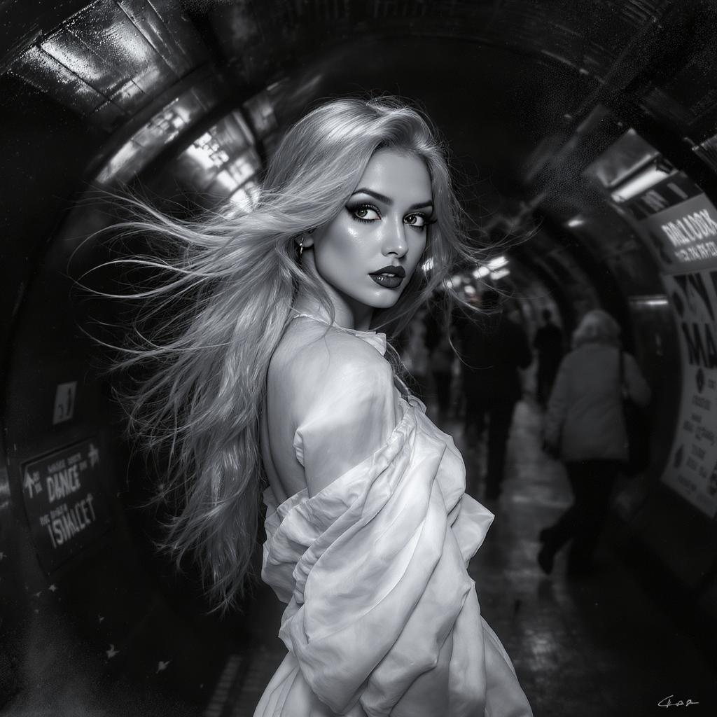 A striking woman with flowing long hair stands in a bustling subway station, captured in gritty black and white imagery that channels the allure of classic Hollywood glamour. Her appearance is almost ethereal, as if made of delicate glass, exuding an aura of soft femininity. Her facial features are bold and exaggerated, drawing attention to her expressive eyes that hold a captivating gaze. The scene is rendered with a wet-on-wet blending technique, giving it a fluid, dreamlike quality that blends the harsh environment with her poised elegance.