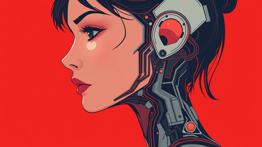 A striking woman with robotic characteristics, her face and neck showcasing exposed circuitry, clean and precise lines with minimal yet sophisticated details. Set against a vibrant red backdrop, her profile exudes a cyberpunk essence with a futuristic flair. The artwork features a 2D flat composition, dominated by red tones, evoking the distinct aesthetic of digital art reminiscent of Studio Ghibli. As a creative twist, subtle hints of glowing elements are woven into the circuitry, enhancing the futuristic appeal.