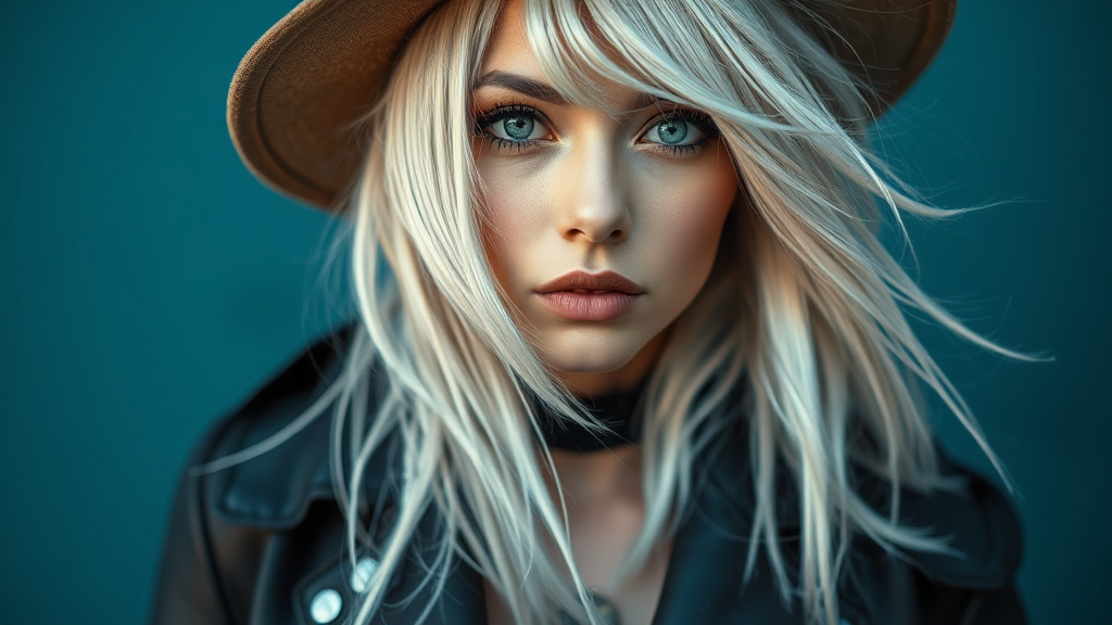 A striking woman with silvery white hair dons a sleek black jacket and a distinctive hat, merging eclectic styles with a palette of light gray and bronze hues. Her appearance is both edgy and ethereal, enhanced by a soft-focus technique and a play of dark whites against deep cyan tones. The image captivates with its blend of soft edges and bold contrasts, creating an eye-catching and memorable visual.