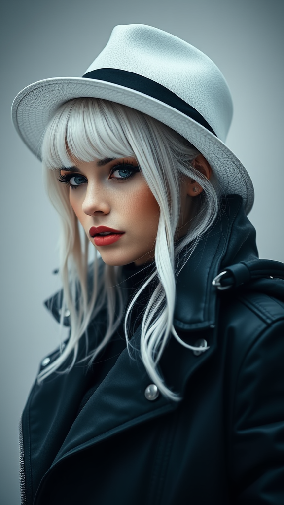 A striking woman with snowy white hair dons a sleek black jacket and a stylish hat, embodying a fusion of contrasting styles. The composition blends light gray with hints of warm bronze, creating an edgy yet ethereal appearance. Employing a soft-focus technique, the imagery is enhanced with subtle gradations of dark white and deep cyan. Softened edges frame her silhouette, resulting in a mesmerizing and arrestingly eye-catching visual.
