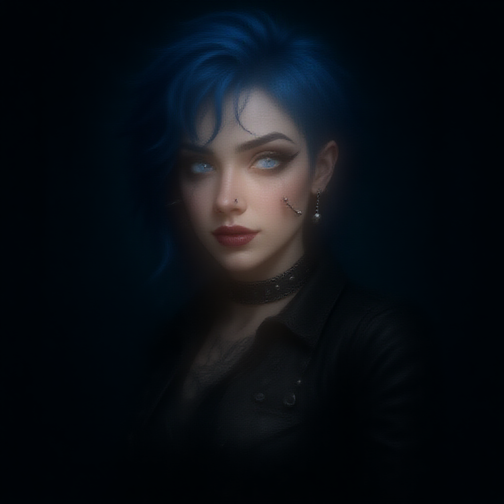 A striking woman with tousled blue hair adorned with piercings stands against a shadowy, industrial backdrop. Inspired by the style of Charlie Bowater, this character portrait is a masterpiece of sharp focus and smooth aesthetics, rendering an incredibly detailed and lifelike representation. Her intense blue eyes seem to glow with an inner light, surrounded by dark makeup that enhances her captivating gaze. She wears a black choker and various pieces of jewelry, including earrings that catch the dim light. Her lips, subtly pierced, add to her enigmatic allure. Her short hair is styled to appear both edgy and elegant. Wearing rock-inspired clothing, a leather shirt reveals a tattoo on her arm, hinting at stories untold. Her upper body is elegantly posed, exuding a rebellious yet graceful aura. The overall composition is enhanced by cinematic lighting, creating intricate details that echo through her realistic eye texture and the bright glow from her piercing eyes. Bright yet muted colors merge in a high-resolution, cartoon-styled image, capturing the essence of a modern, beautifully detailed character with a hint of rebellion.