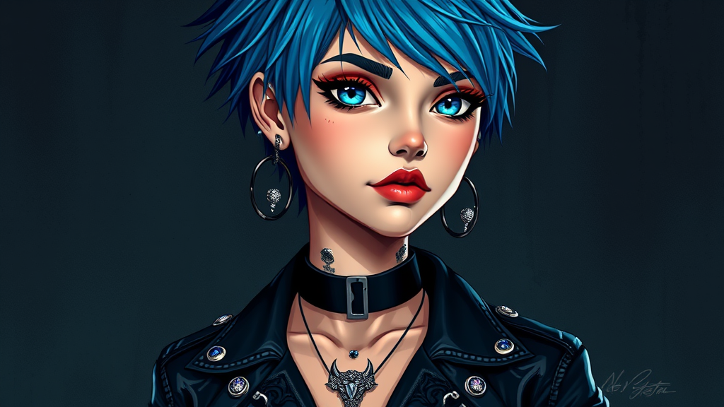 A striking woman with tousled blue hair and bold piercings stands against a dark, industrial backdrop. Her sharp features are reminiscent of Charlie Bowater's artistic style, with an aesthetic characterized by extreme detail and an octane render quality. Her piercing blue eyes shine brightly, framed by disheveled short hair, offering a captivating contrast to the dark, textured background. A black choker adorns her neck, complementing the earrings and jewelry that embellish her skin. Her lips and nose boast subtle piercings, while her outfit—a rock-inspired ensemble featuring a leather shirt with intricate details and a tattoo peeking from beneath—accentuates her edgy allure. The upper body portrait showcases her elegant pose, enhanced by dark makeup and a sense of underlying strength. A beautiful glow highlights her refined features, with cinematic lighting emphasizing the realistic texture of her eyes. The high-resolution image captures every intricate detail, from the realistic eye texture to the delicate shading of her face, merging cartoon and realistic styles seamlessly.