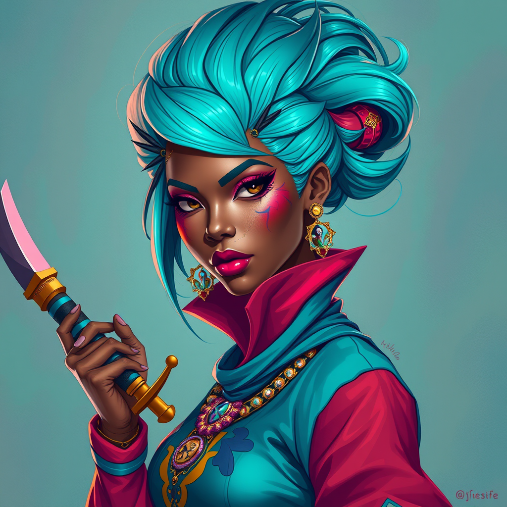 A striking woman with turquoise hair and a vivid ensemble, brandishing a dagger, reminiscent of Rossdraws; an afrofuturistic aesthetic with vibrant, hyper-realistic colors in a stunning blend, combining elements of colorful digital painting, imaginative concept art, and a dazzling cartoon style with deep, bold hues that create a breathtaking piece of beautiful digital artwork.