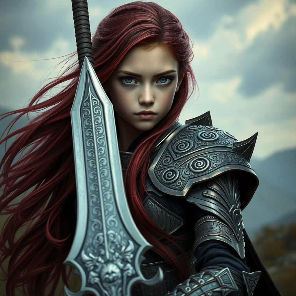 A striking young girl with long, rich burgundy hair flows gracefully over her shoulders, clothed in intricately designed combat armor that glistens with a metallic sheen. She wields a mesmerizing fantasy melee weapon, its surface elegantly engraved with ancient symbols. Her face, a hauntingly beautiful visage, merges elements of the ethereal and the ominous, captivating yet menacing, with eyes that hold an intense, deadly focus. The scene is captured in sharp, ultra-realistic detail, depicting her in a full-length landscape composition rendered in breathtaking 8k resolution. The artistry is a harmonious blend of hyper-realism and fantasy, inspired by the styles of Artgerm, Greg Rutkowski, and Alphonse Mucha, creating a concept art piece that feels both timeless and otherworldly.