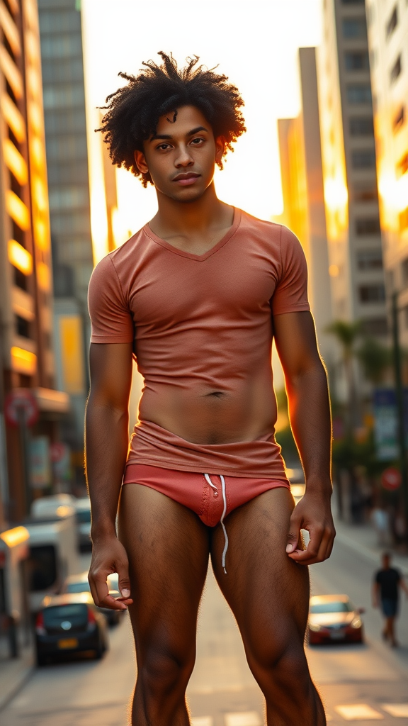 A striking young man stands confidently in a vibrant cityscape during the golden hours of late afternoon. His handsome, muscular frame is complemented by a snug-fitting T-shirt and revealing shorts that showcase his athletic build. Of Mexican American descent, his Latino heritage radiates through his flawless features and sun-kissed skin. Short, black curly hair glows under the bright sun, while the light cascades down his perfectly sculpted face and highlights the natural sheen of his chiseled hands. His muscular, hairy legs gleam in the warm sunlight, leading to well-defined feet grounded on the bustling urban terrain. Positioned for an award-winning full-body portrait, this photograph captures the essence of youthful vigor through the lens of a Hasselblad 500C with a 55mm f/1.8 lens. Taken on Kodak Portra 800 film, the image boasts an extreme depth of field and utilizes available light to produce a high-contrast, Ultra HD, HDR depiction. The shot conveys a dynamic sense of detail and presence, rendering the scene in 8K with stunning clarity.
