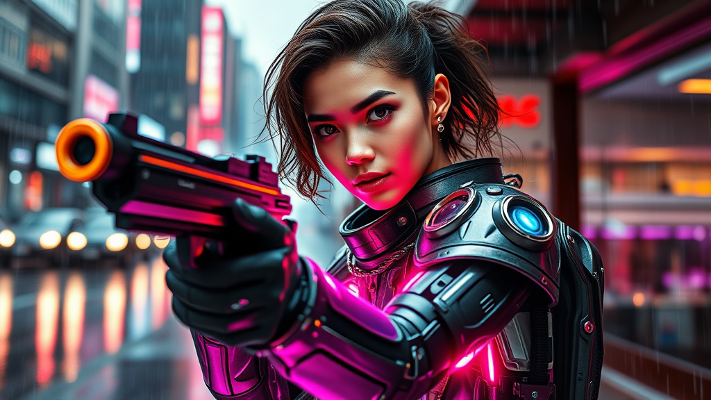 A striking young woman exuding an air of ethereal beauty, embodies the essence of a goddess clad in sleek sci-fi medium armor adorned with vibrant neon lights. Her radiant white eyes shine amidst the urban backdrop where rain pours and streets shimmer with reflections. The scene captures her in dynamic slow motion, her whole body poised with confident energy, wielding a sleek sci-fi laser gun. Her perfectly symmetrical face and confident smile radiate resilience and power in the cyberpunk world surrounding her. Her futuristic attire, a blend of latex and advanced materials, seamlessly integrates with a Star Wars-inspired army uniform, evoking a sense of nostalgia and adventure. Her hair, styled to defy gravity, adds to the sense of dynamic motion, all rendered in vivid HDR with intricate detailing. The art bears a photorealistic touch, reminiscent of masterpieces by Artgerm, Greg Rutkowski, and Viktoria Gavrilenko, with stunning lens flares and dramatic lighting, capturing a vivid street scene with a hint of fog and cinematic lens effects. Despite the presence of multiplicity and certain surreal elements like unconventional coloration, the overall composition remains captivating and meticulously detailed, trending on platforms like ArtStation and CGSociety.