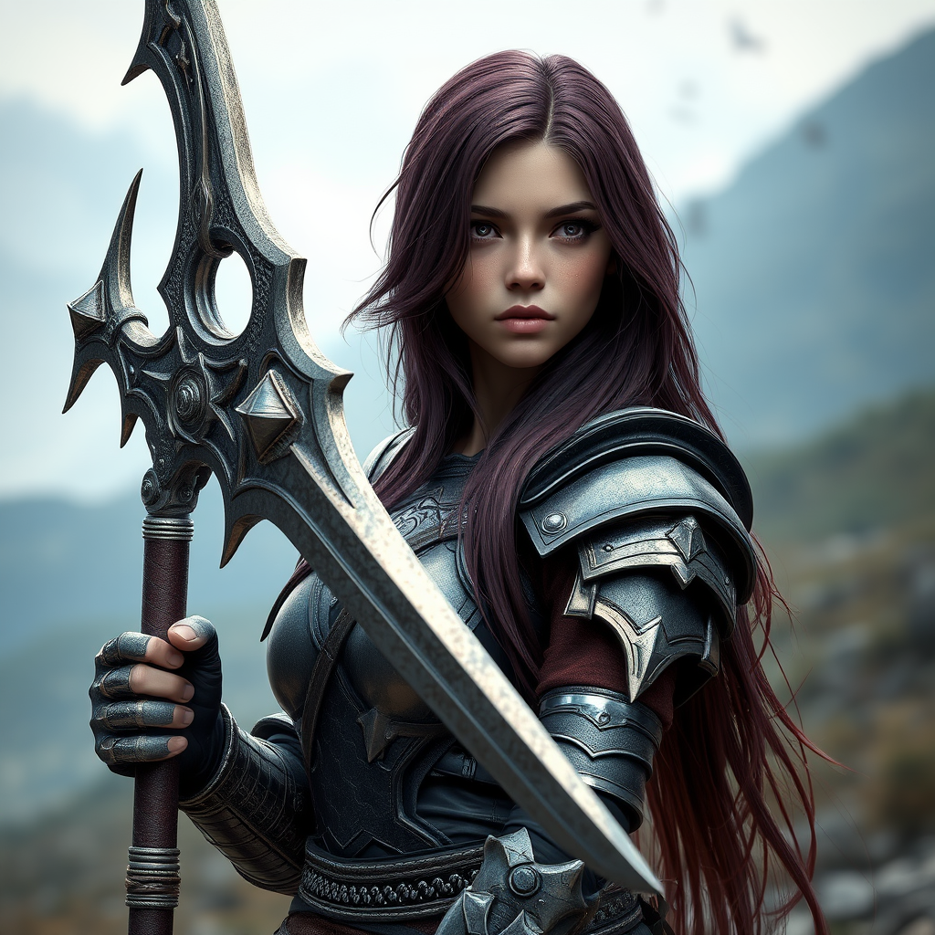A striking young woman with long burgundy hair stands in combat armor, wielding a mesmerizing, fantastical melee weapon. Her face, both elegant and disturbingly deadly, commands attention with intricate details. This full-length, ultra-realistic concept art captures her in sharp focus, presented in an 8k full-frame landscape. The rendering, reminiscent of the styles of Artgerm, Greg Rutkowski, and Alphonse Mucha, blends photorealism with a hint of the surreal, effortlessly brought to life by a masterful touch of the unreal engine and octane rendering.