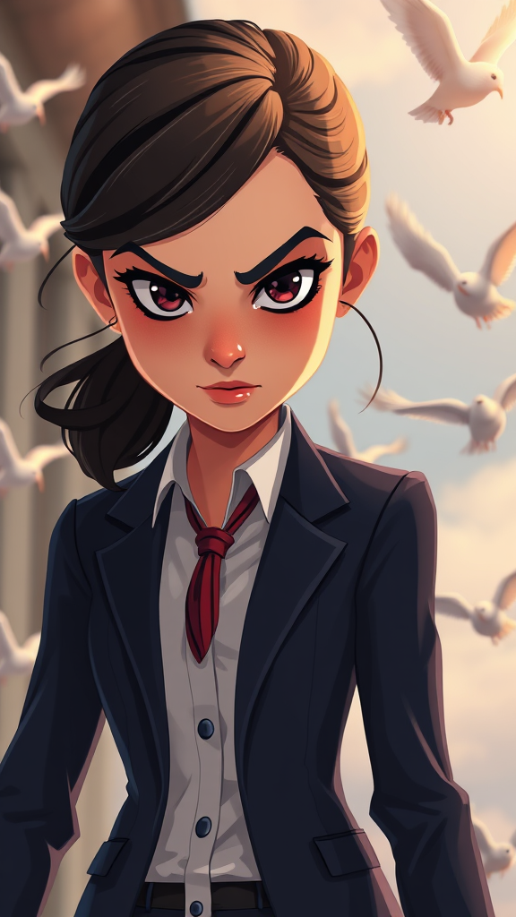 A strikingly beautiful animated illustration features a young girl in a sharply tailored business suit, her expression fiercely determined and intense. Rendered in the style of Unreal Engine 5, the scene captures her in a cartoonish caricature that is both lifelike and uniquely expressive. The artwork combines elements of animated gifs with enchanting, detailed illustrations of birds flying gracefully in the background. As the camera zooms in for a close-up, the scene transforms into a soft, almost romantic moment, emphasizing the girl's resolute gaze. The atmosphere is stylized, blending realism with a whimsical essence that makes the composition irresistibly captivating.