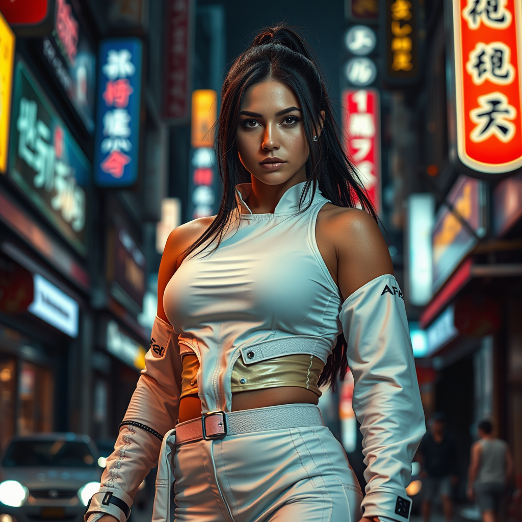 A strikingly beautiful athletic woman samurai adorned in sleek white cyberpunk streetwear stands confidently amidst a bustling city street backdrop, her attire a seamless blend of tradition and futuristic style. The scene is masterfully composed, adhering to the golden ratio. Dramatic cinematic lighting casts dynamic shadows and accentuates her poised, determined expression. Gleaming neon signs reflect off her attire, adding an electric vibrancy that infuses the air with tension and excitement, highlighting her as a formidable presence in this urban landscape.