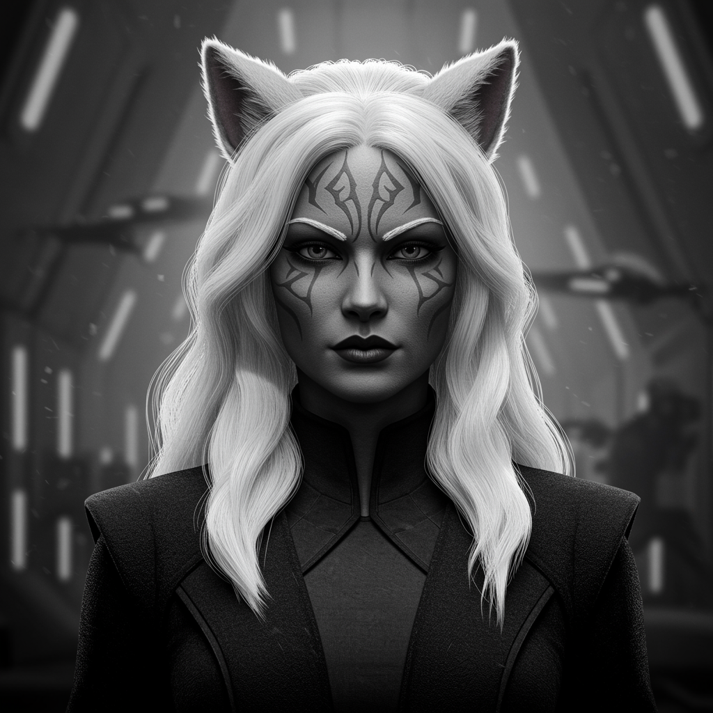 A strikingly beautiful female Sith lord from the STAR WARS universe stands confidently, her white hair cascading around her shoulders, accentuating her elegant feline-like ears. Her face is a work of art, exquisitely detailed and hyperrealistic, capturing the essence of power and allure. She strikes a dynamic pose that exudes confidence and strength against an immersive background that transports the viewer into another world. The scene is rendered in stunning monochrome and grayscale, creating an atmosphere of intensity and focus. The depth of field adds a dramatic flair, drawing the eye to the intricate features of her face and the overall composition. Despite the accompanying sense of danger and darkness, her visage captivates, inviting curiosity and admiration.