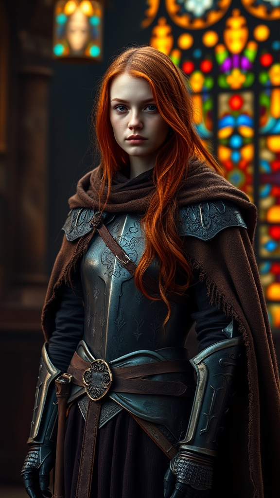 A strikingly beautiful slender young woman with an innocent and naive expression is dressed in intricately detailed, worn gothic knight's armor made from blued steel. Her fiery red hair cascades down her back, contrasting with the backdrop of a dramatic, gloomy atmosphere. She wears a tattered dark brown wool cloak, full of exquisite details, hanging gracefully over her shoulders and shifting with the surrounding natural golden hour light. Her armor catches reflections, highlighting the natural textures of the steel. The background is expressive, with a hint of stained glass lighting adding a cinematic touch to the scene, where vibrant hues dance across the somber setting. Her attire is complemented by a short skirt paired with tights under the armor, while her neck and arms remain uncovered, displaying a delicate elegance. The atmosphere is charged with a sense of mystery and enchantment, as if she steps out from a dark fantasy tale, surrounded by the interplay of shadow and light, with gold and colorful reflections interspersed throughout, adding a fascinating depth to the composition.