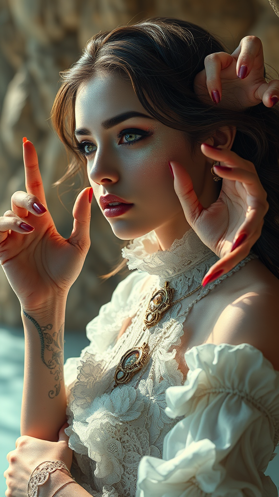 A strikingly beautiful woman dominates the scene, captured in exquisite detail with a stunning blend of techniques. Her presence is a photorealistic masterpiece, evoking the style of Aaron Horkey and Jeremy Mann, enriched with the intricately detailed fluidity reminiscent of Jean Baptiste's gouache work. The image leans into maximalist concept art, captured in 8k resolution, showcasing complex elegance and fantastical themes. The setting bathes in natural and volumetric lighting, enhancing the allure of the subject amidst an expansive backdrop. Unexpectedly, there are elements of surrealism: two faces and multiple limbs create a sense of mutation and distortion. Extra fingers and hands, along with occasional body part duplications, invite a haunting yet mesmerizing atmosphere. Despite these anatomical anomalies and warped features, the portrayal remains powerfully compelling, teetering on the edge of beauty and grotesque mystery, encapsulating a dreamlike quality where fantasy and reality intertwine seamlessly.