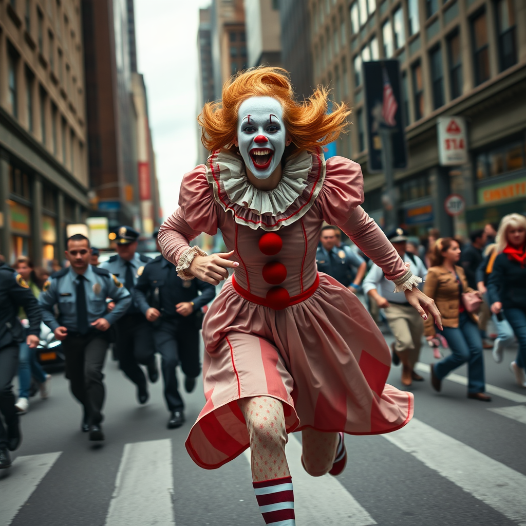 A strikingly beautiful young woman dressed as the iconic Pennywise clown, her face painted with an unnerving yet enchanting smile, sprinting through the bustling streets of New York City. Her laughter echoes with a hysterical intensity, a jarring contrast to the chaos around her. In hot pursuit, a group of bewildered police officers navigate the crowded thoroughfare. The scene captures the surreal humor and intensity, with photorealism bringing every detail to life, from her colorful clown costume billowing in the wind to the expressions of surprised onlookers. The urban backdrop amplifies the vivid tension of this thrilling chase.