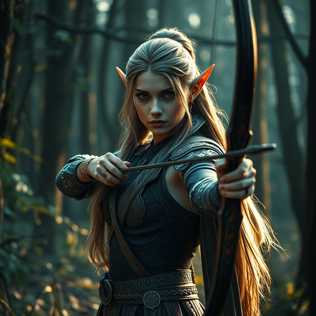 A strikingly detailed and enchanting female elf archer stands poised in a mystical forest, drawing inspiration from RPG and dungeons & dragons, her attire adorned with intricate patterns and rich textures. The interplay of light and shadow paints a dramatic and hyperrealistic scene, capturing her ethereal beauty and mastery with photorealistic precision. Cinematic atmosphere envelops her as the forest's vibrant colors and mysterious aura blend seamlessly in a majestic 8k resolution. Her piercing eyes gleam with wisdom and resolve, a testament to her otherworldly heritage and warrior spirit.
