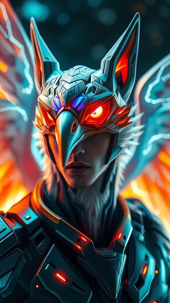 A strikingly detailed and masterfully drawn gay male protogen fursona features as a majestic thunderbird with iridescent lightning wings. The cyberpunk headshot is perfectly framed with dramatic, cinematic lighting and subtle glow effects that highlight the intricate design. Set against a SciFi background, the mecha elements are seamlessly integrated with sharp focus on each detail. The scene is enriched with bokeh, casting vivid colors across the 16k UHD canvas, ensuring the HDR10 absurd resolution stands out. The male protogen's expression is intense and engaging, inviting viewers into a futuristic world of vibrant energy and electric dynamism, as envisioned through Model: Lyriel v. 1.5, with creative adaptations that enhance the visceral and immersive experience.