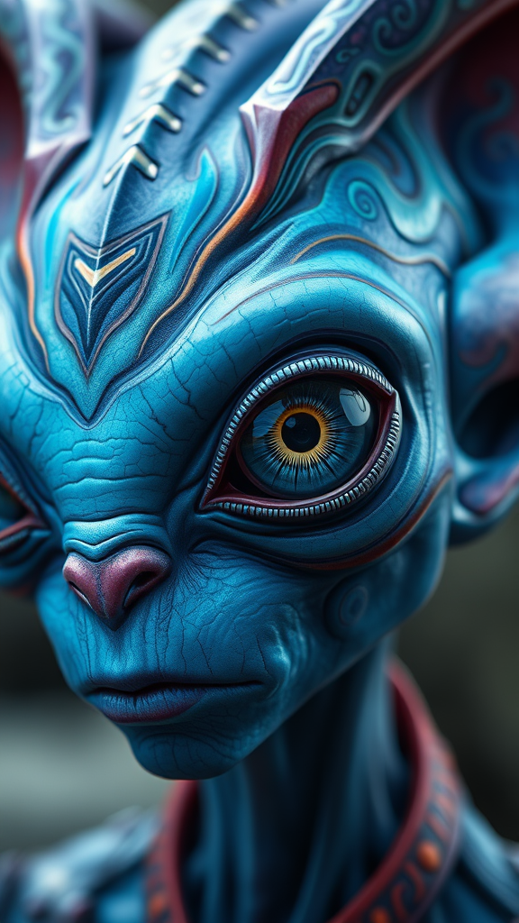 A strikingly detailed portrait of a blue alien with one large, mesmerizing eye and oversized ears, adorned with vibrant, swirling colors. The design is intricate and symmetrical, showcasing a meticulously crafted face with rich textures and detailed skin. Cinematic lighting accentuates the epic sci-fi and fantasy elements, creating an ultrarealistic, hyper-detailed digital masterpiece in sharp focus, reminiscent of an 8k cinematic still. The character radiates a sense of otherworldly presence, with a composition that captures every nuance in a breathtaking digital painting style, embracing the wonders of high-definition realism and the allure of futuristic artistry.