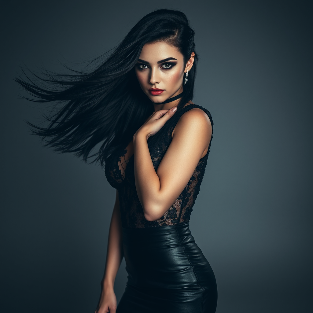 A strikingly elegant goth woman with flowing raven hair poses confidently in an alluring black lace top and a sleek black leather mini skirt, captured using a Fujifilm X-T4 with a Sony FE 85mm lens at 32k resolution. The dark, moody atmosphere accentuates her bold makeup and expressive eyes, set against a minimalist backdrop that highlights her distinctive style and enigmatic allure.