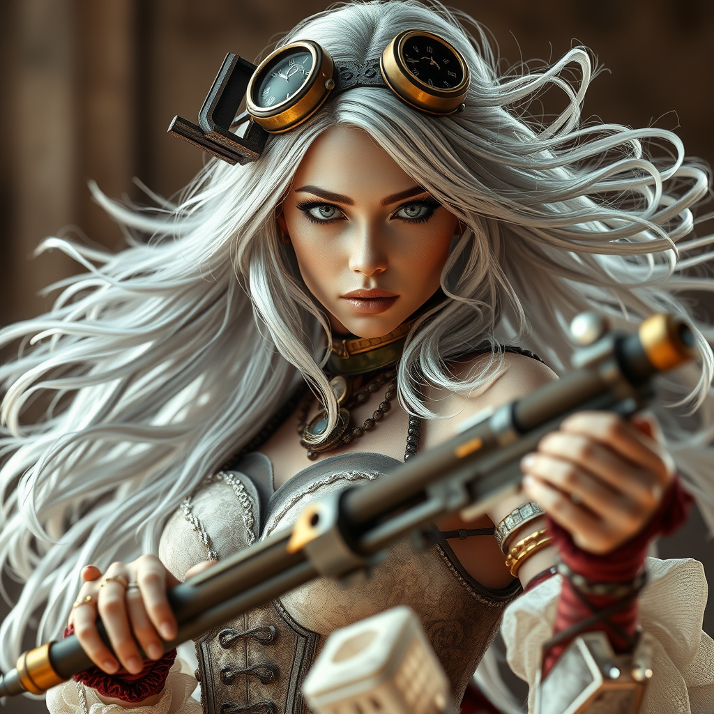 A strikingly enchanting Steampunk woman with flowing silver hair, adorned in an intricate steampunk ensemble and wielding a uniquely designed weapon, captured in hyperrealistic detail and photorealistic quality, 8k resolution, crafted using cutting-edge rendering technology; dimensions in a cinematic 9:16 aspect ratio with an expressive and dynamic style, maintaining a fine balance of elaborate textures and vivid contrasts, with a slightly whimsical touch to accentuate her ethereal beauty.