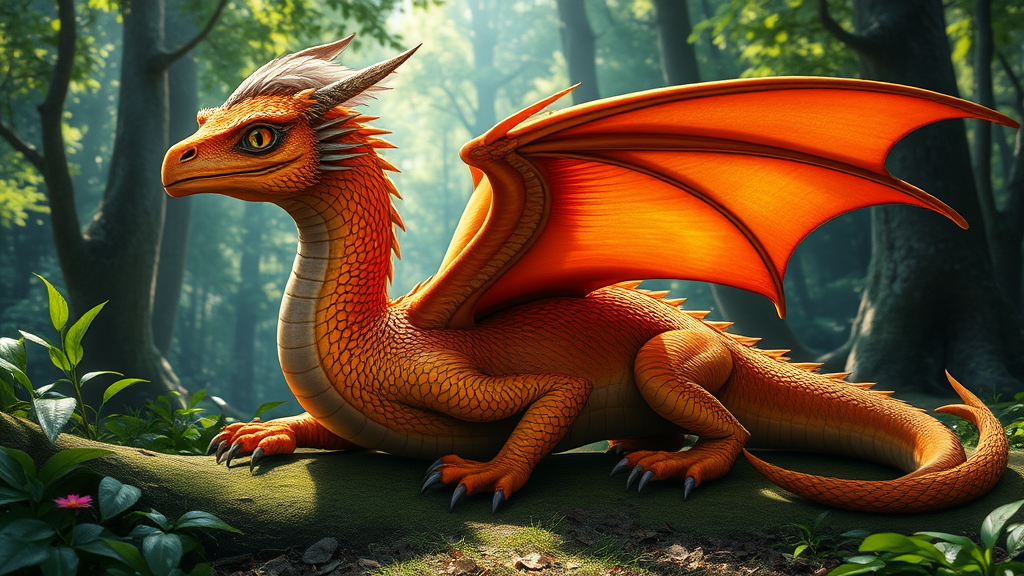 A strikingly handsome and charming orange dragon rests elegantly in a vibrant, lush forest, embodying the essence of a dnd character with fantasy elements. Its realistic, intricately textured skin shimmers in the dappled sunlight filtering through the canopy. An eagle's feather adorns its head, adding an air of mystique and regality. Its majestic falcon-like wings are folded gracefully, waiting to unfurl. The dragon's powerful lizard-like legs give it a strong komodo stance, while its raptor-like features hint at a keen intelligence and agility. Its large, glowing eyes radiate a magical aura, captivating any who dare to gaze into them.