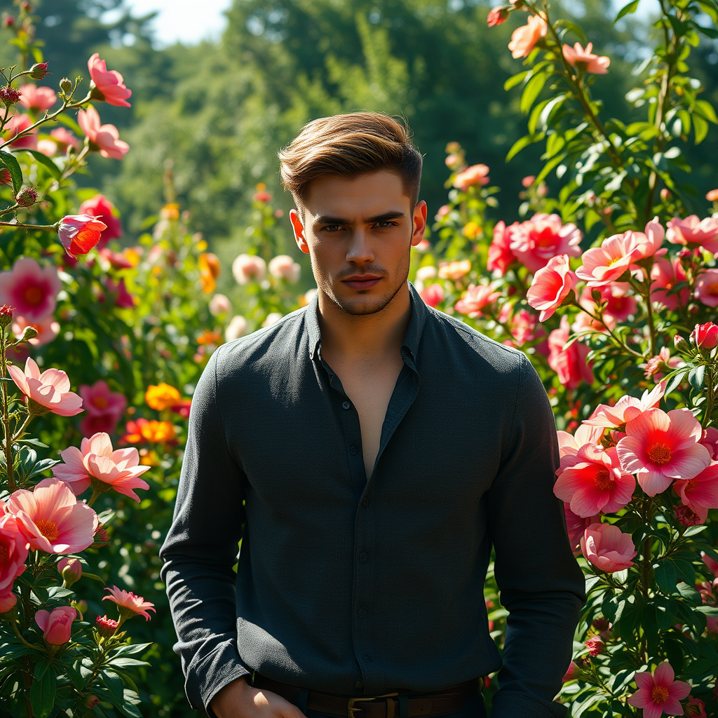 A strikingly handsome man stands amidst a lush garden brimming with vibrant blooms, the scene reminiscent of an exquisite Paulina Góra painting with the intricate floral detailing of Rachel Ruysch, as sunlight dances through the petals casting a gentle glow over the serene landscape.