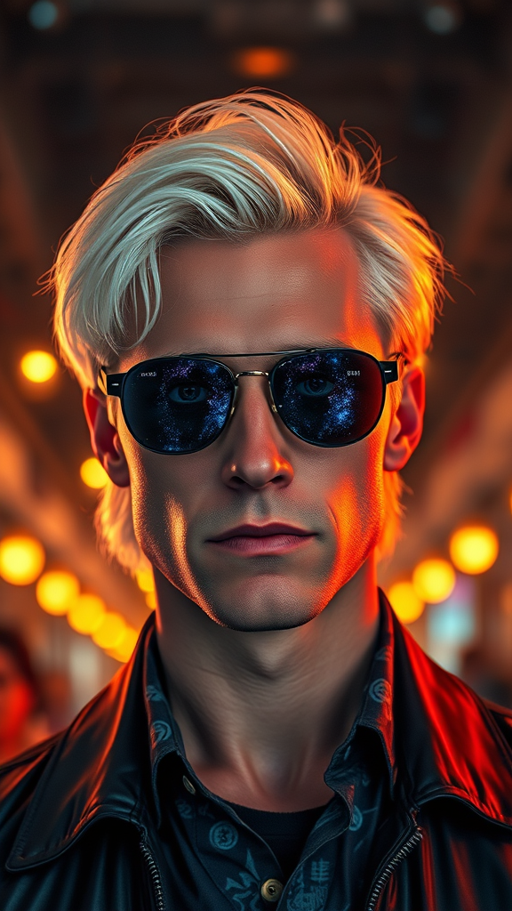 A strikingly handsome man with medium-length white hair stands confidently, exuding an aura of enigmatic charm. His signature sunglasses rest casually on the bridge of his nose, slightly lowered to reveal captivating deep blue eyes that sparkle like a cosmic galaxy. This hyper-realistic scene captures his gaze directly at the viewers, drawing them into a world of intricate details and immersive atmospheres. The environment around him hums with a surreal vibrancy, as if the universe itself bends to the allure of his compelling presence.