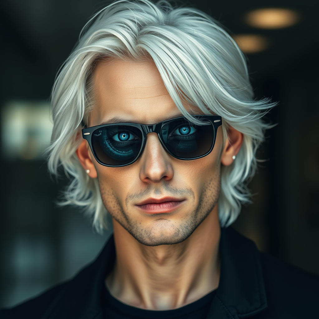 A strikingly handsome man with snowy white, medium-length hair stands confidently, exuding an aura of enigmatic charm. His stylish sunglasses rest casually on the bridge of his nose, partially revealing a glimpse of his mesmerizing deep blue eyes, resembling a swirling galaxy. He gazes intently at the viewer, inviting them into his mysterious world. The hyper-realistic atmosphere around him captures every intricate detail, from the subtle play of light reflecting off his glasses to the texture of his skin, rendered in stunning 8k resolution, enhancing the surreal beauty of the scene.