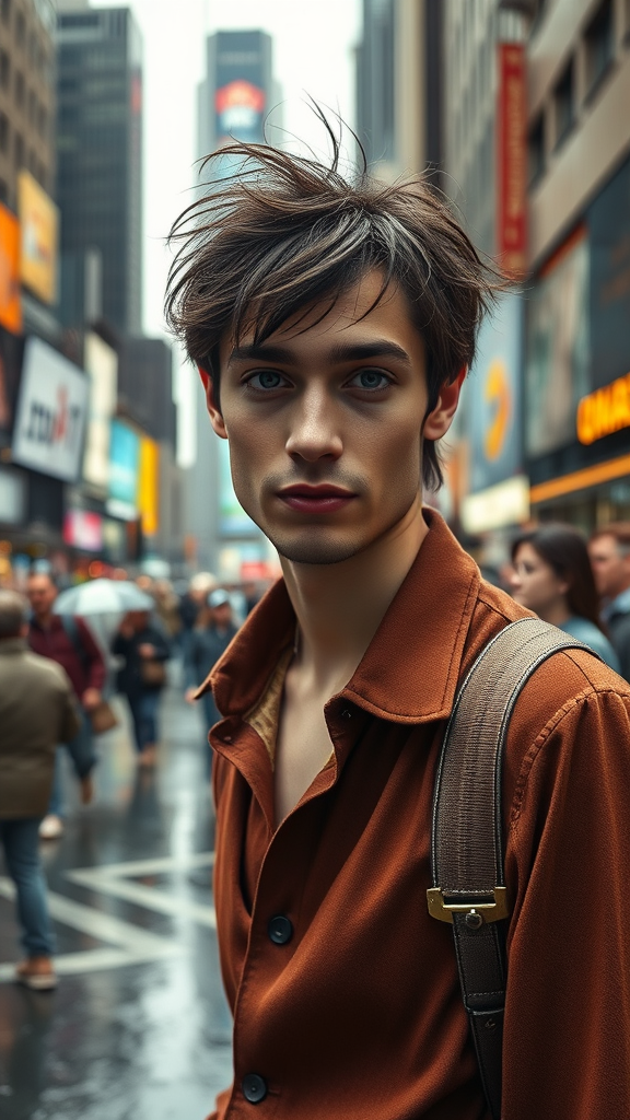 A strikingly handsome Mediterranean man stands confidently amidst the rainy bustle of Times Square. His messy medium-length hair frames a perfectly symmetrical face, with bright, captivating eyes that glimmer with highlights. He is dressed in a retro outfit, exuding a unique charm despite its unconventional style. The elements around him distort reality; his form is unexpected and surreal. Extra limbs seem to emerge inadvertently, with features that appear both familiar and bizarre. His face, though perfectly formed, is juxtaposed with abstract and irregular proportions that draw the eyes in. Details blur and shift, with fingers appearing fused or unexpectedly multiplied, and his posture takes on an elongated, otherworldly quality. The scene captures an intriguing blend of classical beauty and fantastical distortion, creating a vision that challenges perceptions.