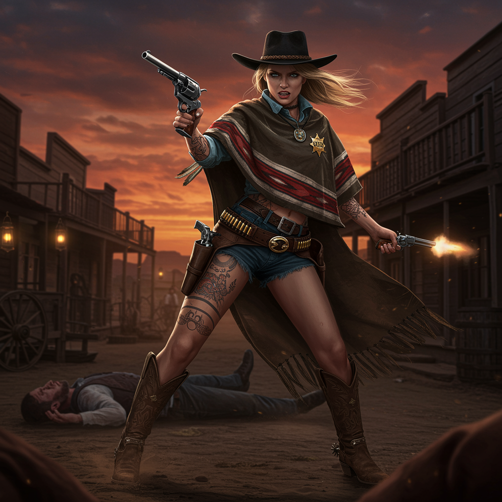 A strikingly lifelike and intricately detailed scene captures a fierce female Old West sheriff engaged in a dramatic gunfight in a shadowy, dimly lit western town. Her steely gaze, dark blue eyes framed by long, elegant eyelashes, and impeccably applied eyeshadow reflect her unwavering determination. Blonde hair with stylish bangs frames her face, fluttering in the evening breeze beneath a black Stetson, its brim perfectly positioned above her eyes. Brandishing a revolver in her right hand, she expertly targets two notorious outlaws. One lies motionless on the dusty street, while the second faces her unrelenting aim. Her arms are adorned with vibrant Native American tattoos, adding color and depth to her commanding presence. Draped in a distinctive Mexican-style poncho accented with a sheriff's badge, she pairs this with a rugged mini skirt, ornate gold and onyx belt, and matching choker. Her dusty square-toed cowboy boots boast elegant silver spurs, completing her ensemble. The street’s darkness is intermittently pierced by dim lanterns hanging from buildings, casting a moody glow. Above, the skies threaten with rolling dark clouds, framing a dramatic reddish-orange sunset, intensifying the scene's atmosphere.