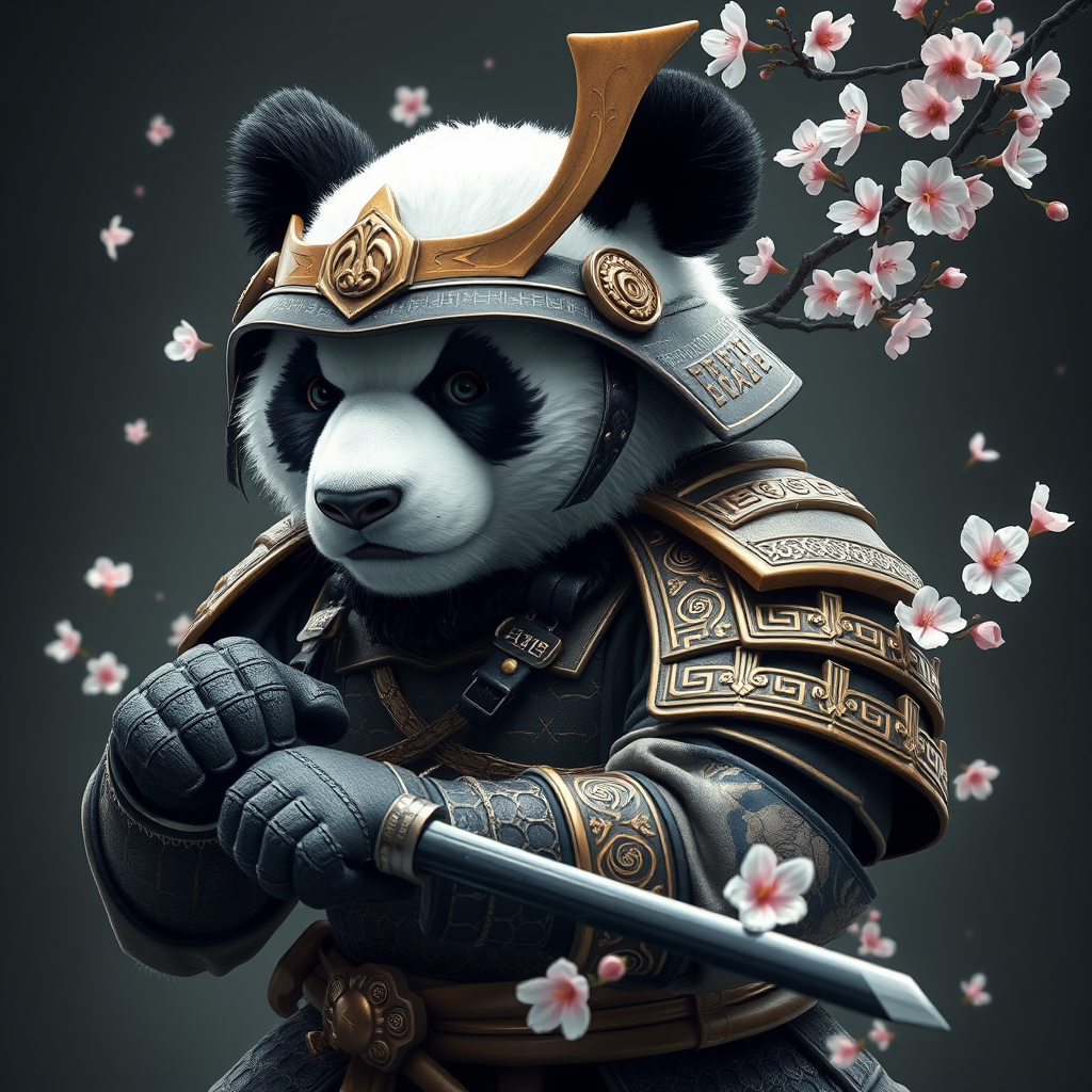 A strikingly lifelike depiction of a Samurai Panda, combining the iconic black-and-white markings of a panda with the intricate elegance of traditional Japanese samurai armor. The armor, a blend of history and fantasy, is adorned with elaborate patterns and delicate hints of bamboo motifs. The panda stands proudly, gripping a katana with a serene yet powerful expression, while cherry blossoms gently swirl around, adding a touch of whimsy to this captivating scene.
