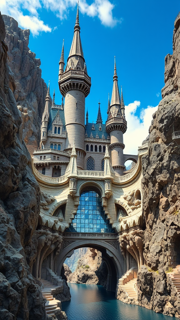 A strikingly realistic sculpted castle with intricately carved stone walls rises majestically from the rugged terrain of the rocky mountains, embodying a fusion of gothic futurism that echoes the artistic influences of Eve Ventrue and Filip Hodas. This architectural marvel unfolds as structured chaos, where imposing towers and spires twist and stretch skyward in a mesmerizing dance of elaborate detail. Below, a gracefully arching passage spans a shimmering body of water, its surface mirroring the vibrant hues of the open blue skies above, creating a captivating interplay of light and reflection.