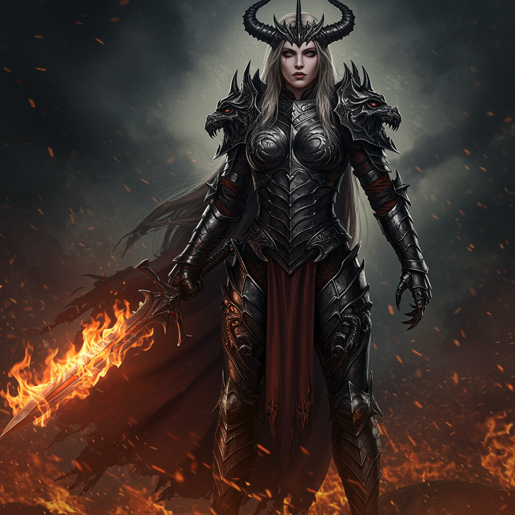 A strikingly realistic woman clad in terrifying black armor, adorned with intricately designed dragon motifs, wields a blazing fire sword. Her human face, characterized by long flowing hair, displays an astonishing level of detail and sharp focus, blending beauty with an unsettling intensity. The character, captured in an epic and commanding pose, is depicted with super detailed full body features that highlight the intricacies of her armor and the fierce power she exudes. Set against a dramatic backdrop of swirling fire and ash, the scene echoes an epic resonance, immersing the viewer in its horror-infused atmosphere. The composition retains a lifelike quality, emphasizing high resolution and realism, embracing its epic narrative through subtle creative elements.