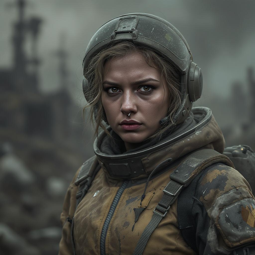 A strong and determined woman stands in a battered fallout suit against an apocalyptic background, her penetrating gaze meeting the viewer's eyes. This portrait captures the essence of realism, showcasing detailed skin texture and the striking intensity of photo-realistic quality. The scene is rendered in 8k resolution, rich in high detail and RAW color depth. Her expression is enhanced by subtle piercings, surrounded by diffused, soft lighting that creates an atmosphere of cinematic, yet intimate storytelling. The shallow depth of field and sharp focus highlight her as the centerpiece of this hyperrealistic scene, where every nuance of her persona comes alive amidst the chaos. There are intentional creative choices that ensure the portrayal remains authentic and evocative, emphasizing her resilience in this dystopian world.