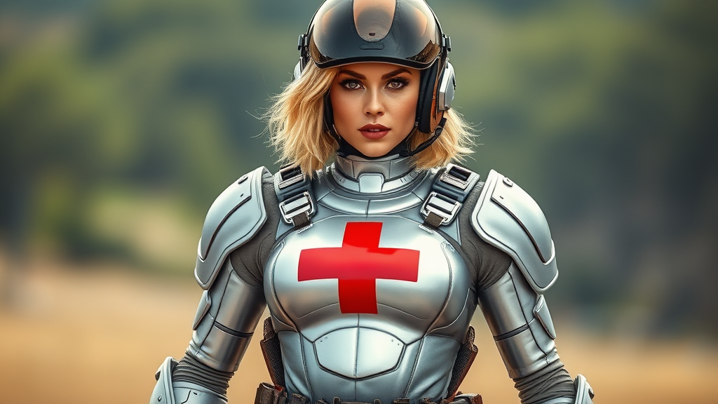A strong, athletic adult woman with shoulder-length platinum blonde hair, clad in sleek silver combat armor and a sleek metallic catsuit. Her attire is complemented by a robust utility belt and sturdy silver gloves. The armor prominently displays a vibrant red cross emblem on the chest, signifying her role as a medic. Her head is protected by a sophisticated fighter pilot helmet featuring an advanced visor, emphasizing her readiness and professionalism.