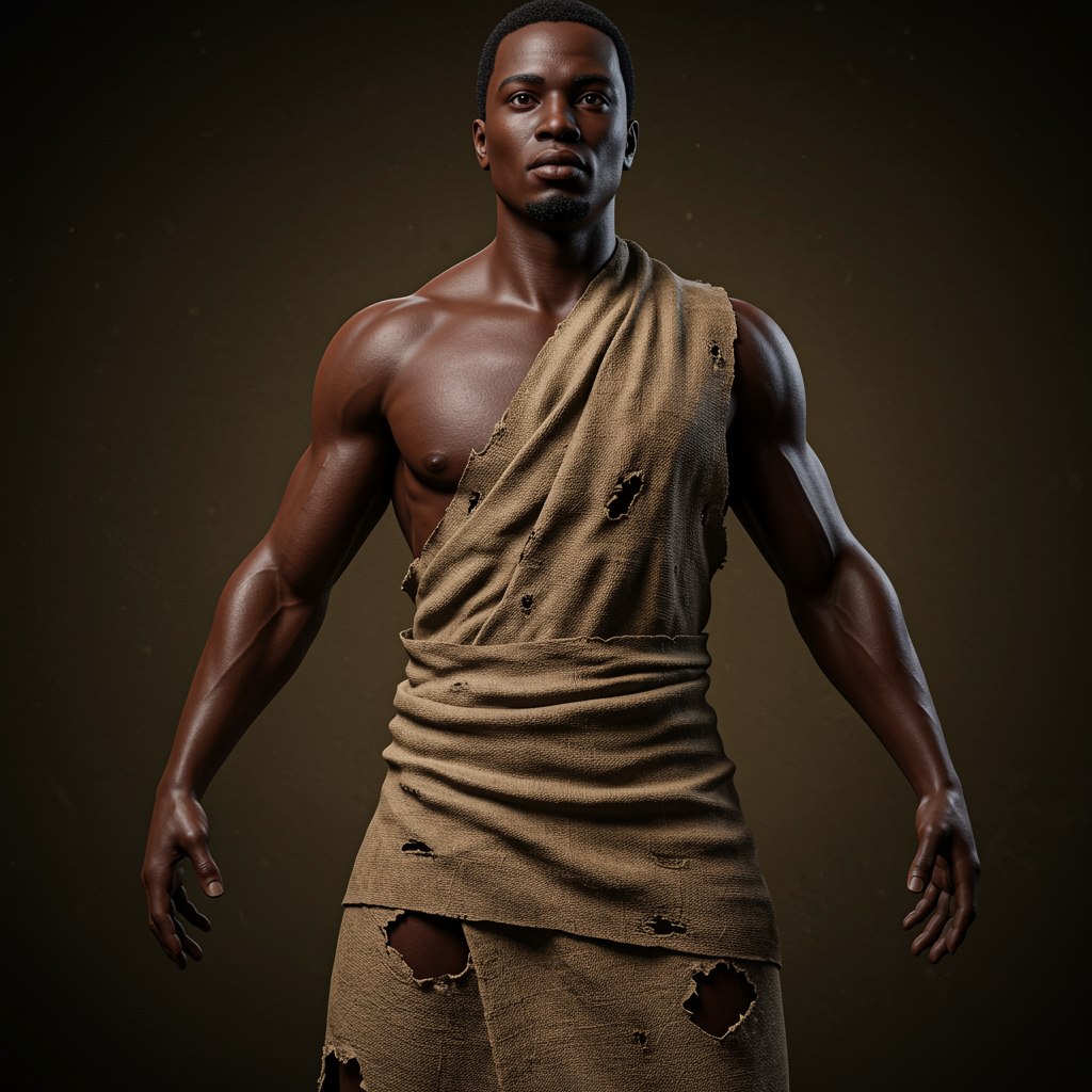 A strong, handsome Black man wrapped in weathered, worn fabric stands in a dynamic, lifelike pose. His muscular build is highlighted by crisp, natural lighting that accentuates the details of his face and physique. The background is richly detailed, evoking a sense of realism and depth. Using a palette of natural colors, the scene is captured in stunning 8k resolution with photorealistic quality. This piece of art, influenced by the styles of Artgerm, Greg Rutkowski, Alphonse Mucha, Loish, and WLOP, would be fitting among trending works on Tumblr. The composition presents a perfect blend of classic artistry and modern flair, showcasing the figure in a powerful, yet serene setting.