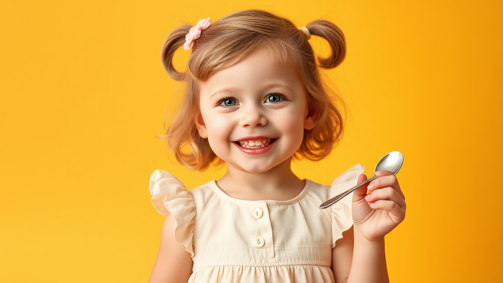 A studio portrait of an adorable 3-year-old British girl wearing a soft pastel dress, playfully holding a spoon, set against a sunny yellow backdrop. Her cheerful expression radiates with curiosity and charm, capturing the whimsical innocence of childhood with a professional touch.