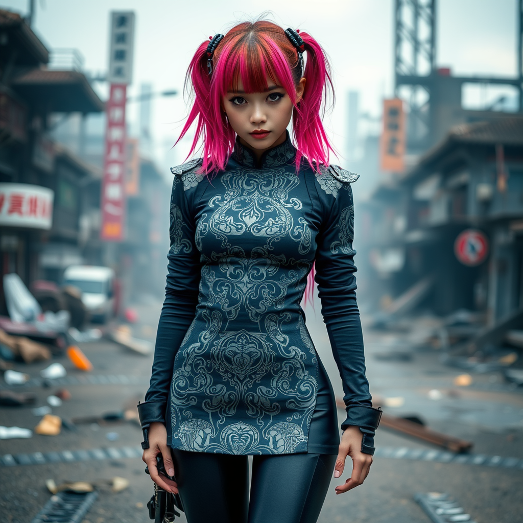 A stunning 18-year-old Japanese girl stands confidently, embodying a dystopian cyberpunk aesthetic with a unique blend of punk and emo style. Her edgy qipao, with intricate futuristic patterns, complements her sleek black leggings, highlighting her rebellious spirit. Against the backdrop of an apocalyptic world, her piercing gaze meets the viewer, exuding a sense of intrigue and danger. Her meticulously detailed appearance, from her vibrant hair to her bold accessories, captures the essence of a formidable character navigating a chaotic landscape.