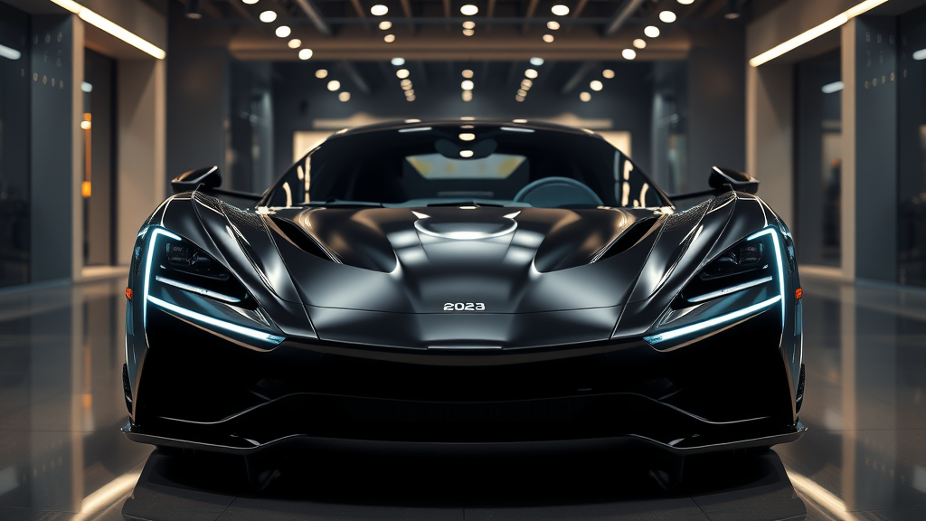 A stunning 2023 supercar featuring an elegant black exterior with sleek silver trim, captured from the front view in a luxurious showroom setting. The scene is illuminated with showroom lights, highlighting the car's dynamic lines and contours in breathtaking detail. Created using Unreal Engine 5, the image is photorealistic with options ranging from 8k to 16k and 4k to HD, incorporating state-of-the-art ray tracing technology for spectacular reflections and a hyper-realistic level of detail. The scene conveys a sense of refined power and modern elegance, embodying the pinnacle of automotive design sophistication.