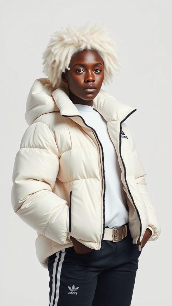 A stunning 26-year-old Afro model with striking white hair, elegantly posed in a luxurious milky Adidas winter puffer jacket, showcasing contemporary design trends influenced by Kanye West. Captured against a pristine white background in 4K resolution, the image highlights intricate and detailed textures with an aspect ratio of 4:5, offering a visually captivating representation.