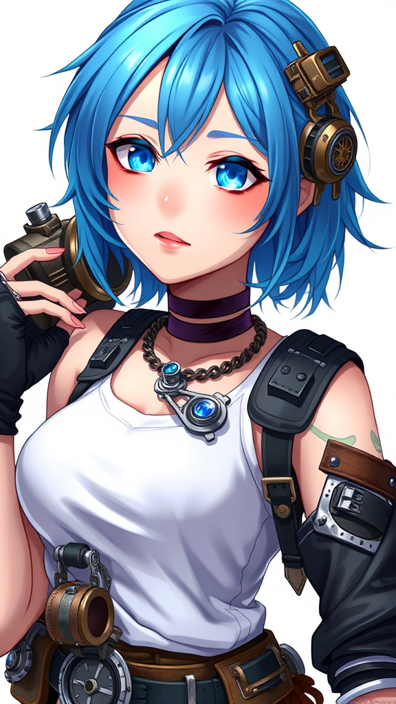A stunning 2D game art image of a youthful woman with striking blue hair and luminous blue eyes, wearing a white tank top beneath intricate steampunk attire. Her anime-inspired appearance is captured in a captivating, dynamic pose. The scene is ultra-detailed, presented against a pristine white background in HD. The design echoes the styles of Hideo Minaba, Yuya Nagai, Ryoji Ohara, Ryota Murayama, and Hitomi Yoshimura, reminiscent of the Granblue Fantasy aesthetic. Subtle creative twists include a unique mechanical accessory and a slightly futuristic touch infused into her clothing.