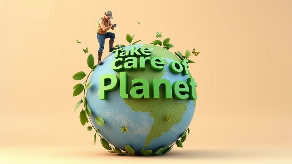 A stunning 3D illustration of a gardener standing on an enormous globe, nurturing it with water. The globe is embellished with vibrant green leaves and butterflies, symbolizing the Earth's vitality and beauty. Set against a soft, serene beige background, the phrase "Take care of the Planet" is prominently displayed in 3D, crafted from lush green foliage and shadow. This serves as a powerful reminder of our duty towards environmental conservation and appreciation. The image is sharp, realistic, and well-composed, with accurate anatomy and harmonious proportions. The gardener is depicted in a natural, balanced pose, conveying a sense of care and responsibility without any distracting elements.