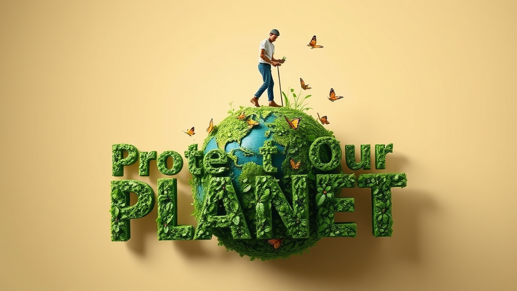 A stunning 3D illustration showcasing a gardener standing atop a vibrant globe, nurturing it with care. The globe is lush with green foliage and lively butterflies, symbolizing the earth's vitality and splendor. The background is a gentle, calming beige, against which the words "Protect Our Planet" stand out in 3D, crafted from verdant leaves and shadow, serving as a vivid reminder of our duty to safeguard and cherish the environment.